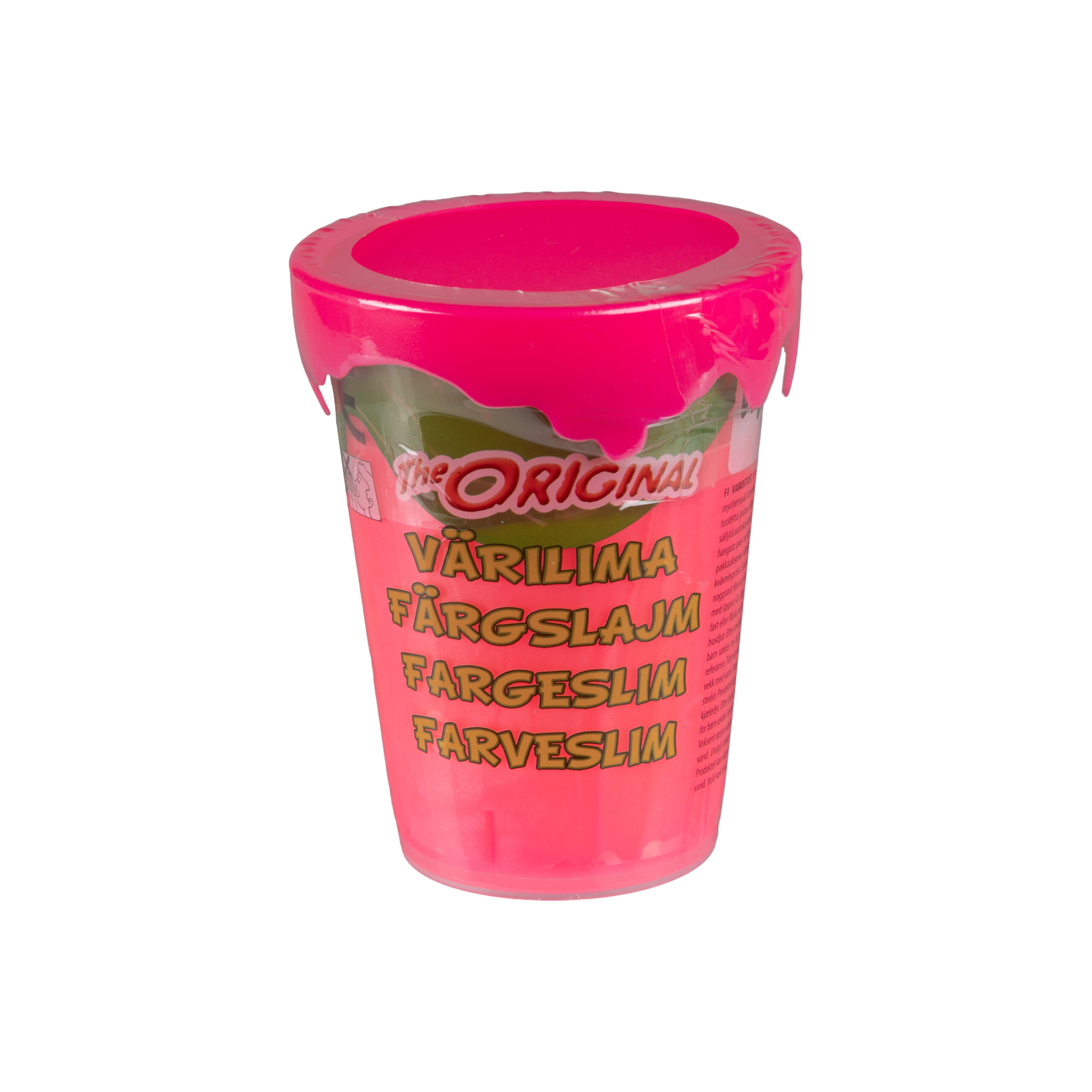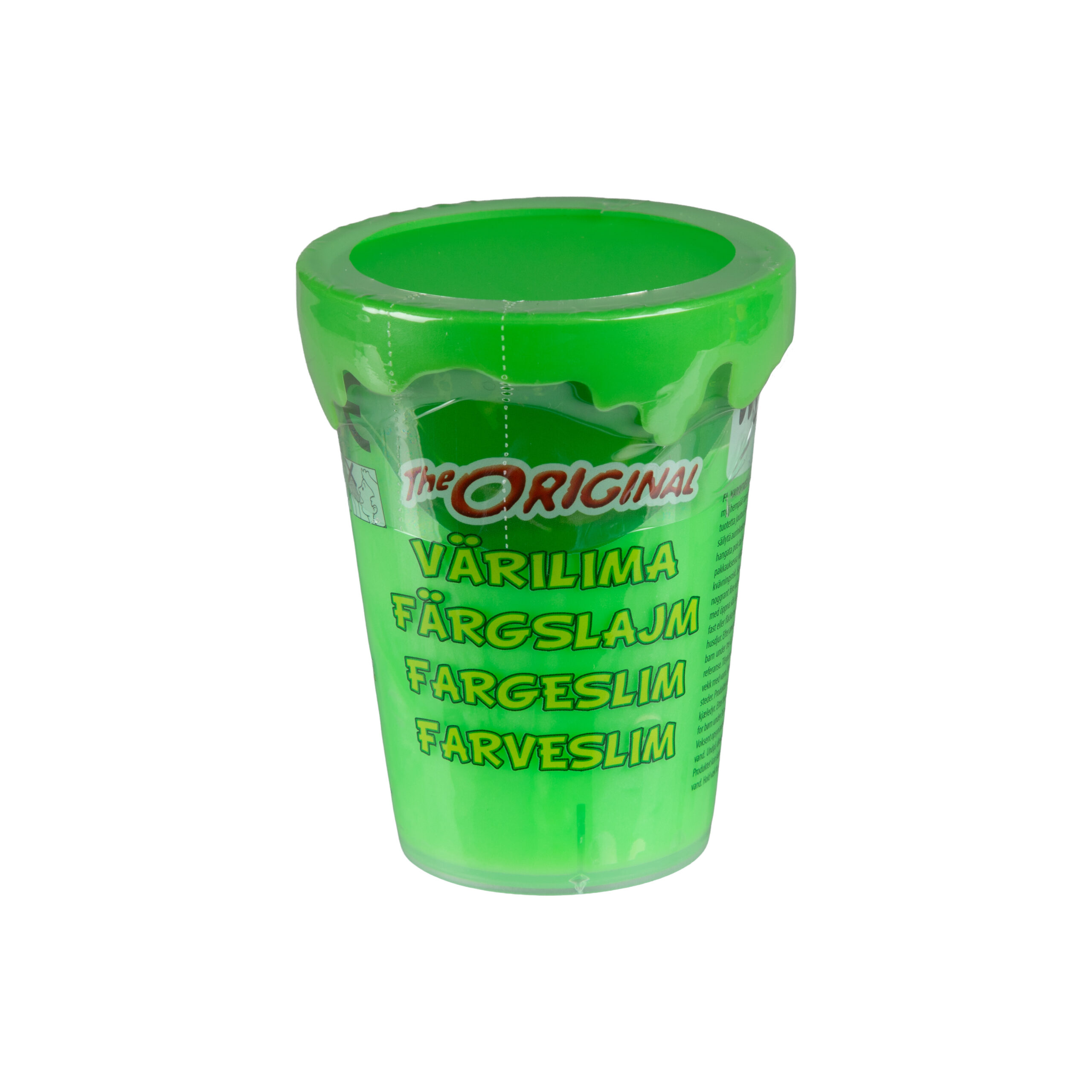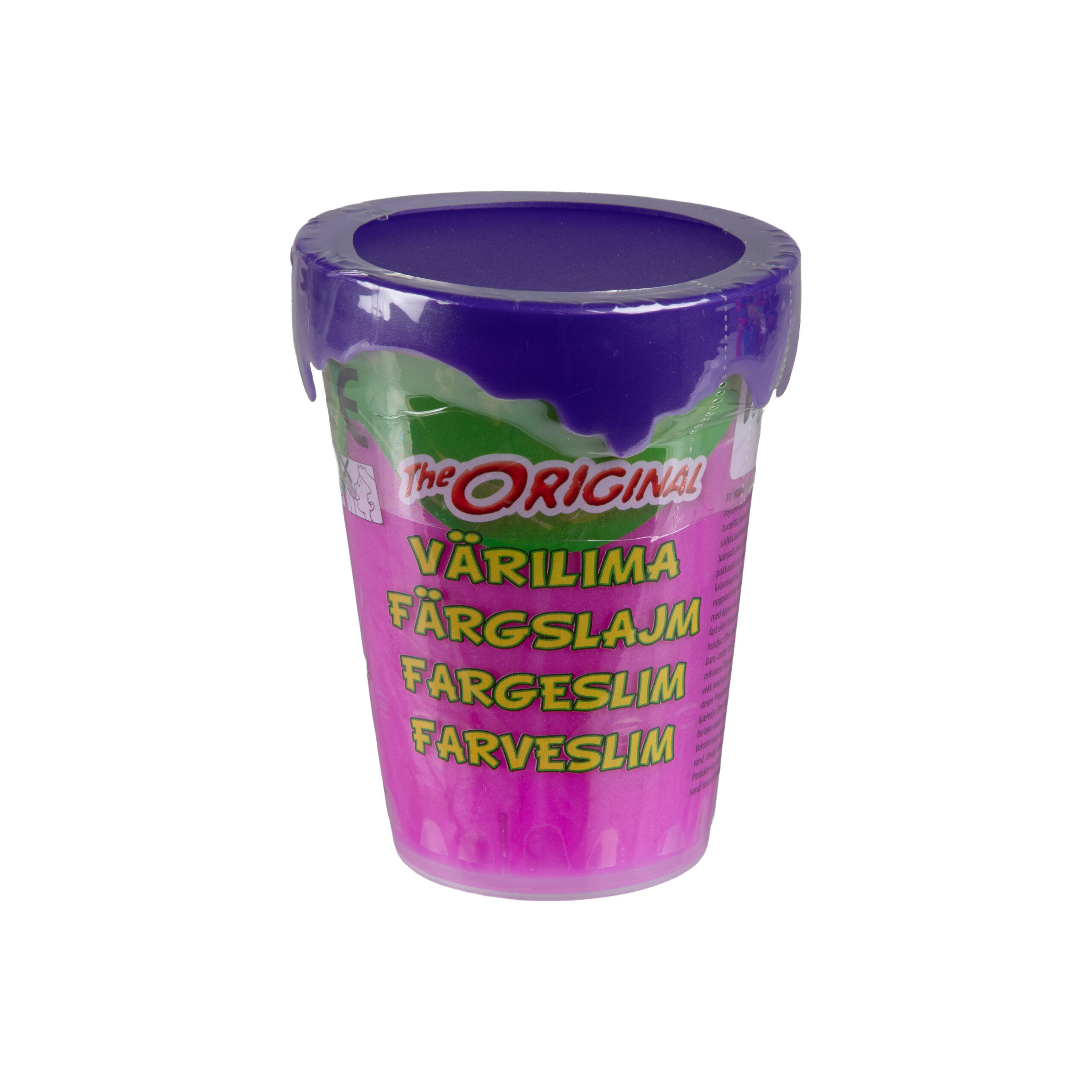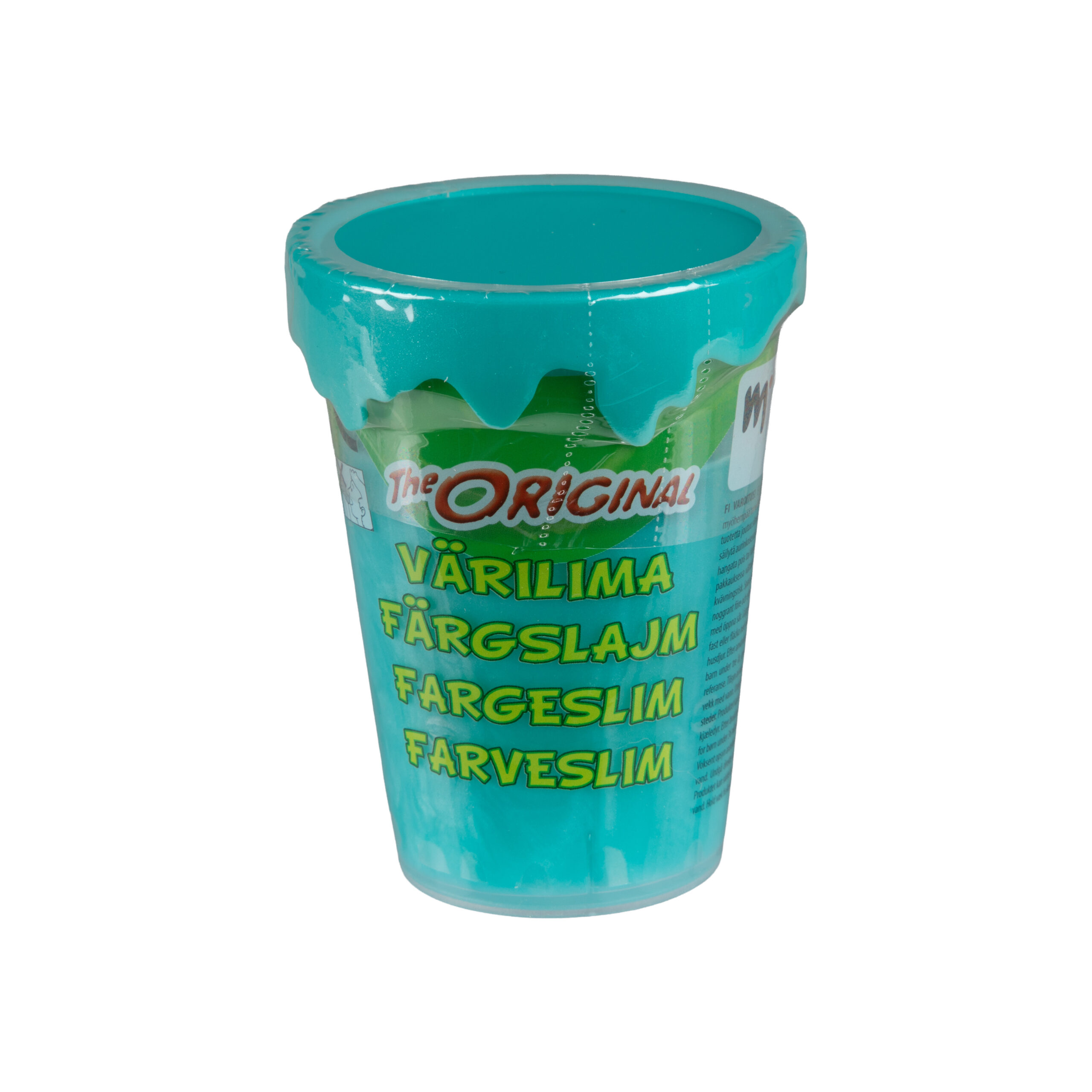 Display med 32 bøtter metallisk skinnende og farverigt slim – hver bøtte indeholder 80 g. Slimet fås i fem farver: lilla, grøn, pink, orange og gul. Slimys slim er af høj kvalitet, sikkert at lege med og gennemtestet. Det er parfumefrit og overholder al gældende EU-lovgivning. Fra 5 år.