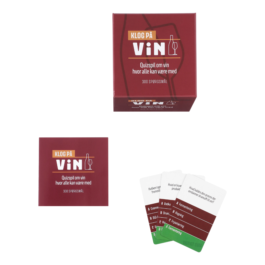 Klog på Vin er et sjovt og hyggeligt quizspil med 300 spørgsmål om vinens verden, perfekt for alle der elsker vin.