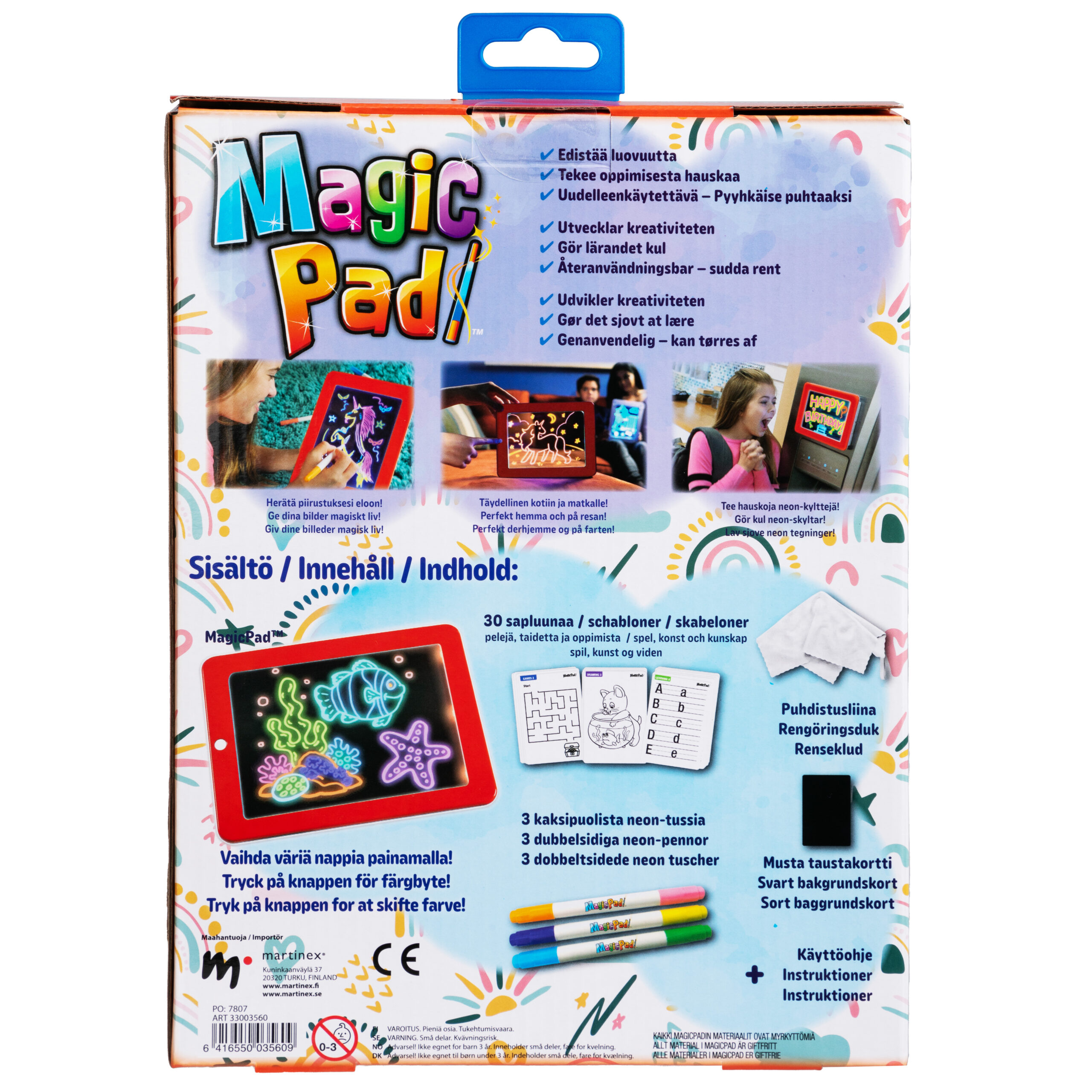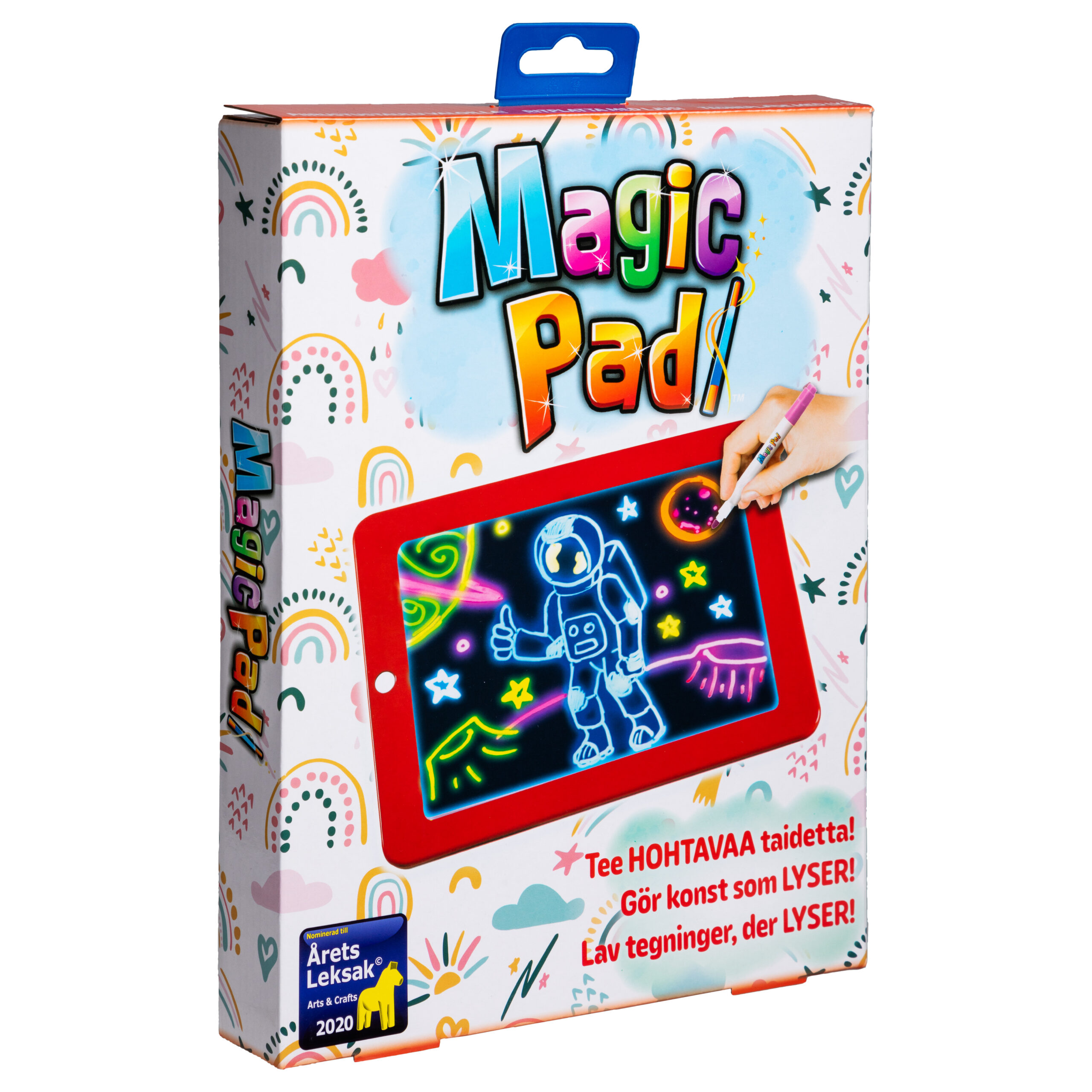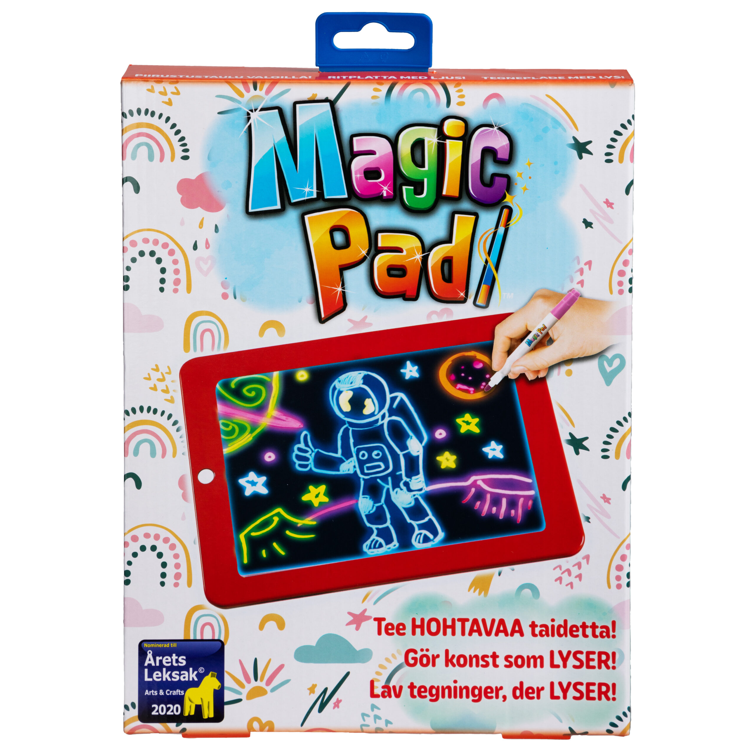 Magic Pad er en sjov tegnetavle, der giver tegningerne liv, tænk lidt magnetisk tegnetavle, lidt whiteboard – men med et twist! Tegnetavlen har otte lyseffekter i forskellige farver, der gør billederne magiske. Lad dit barn bestemme sit eget motiv eller brug en af de 30 medfølgende skabeloner med fx bogstaver.