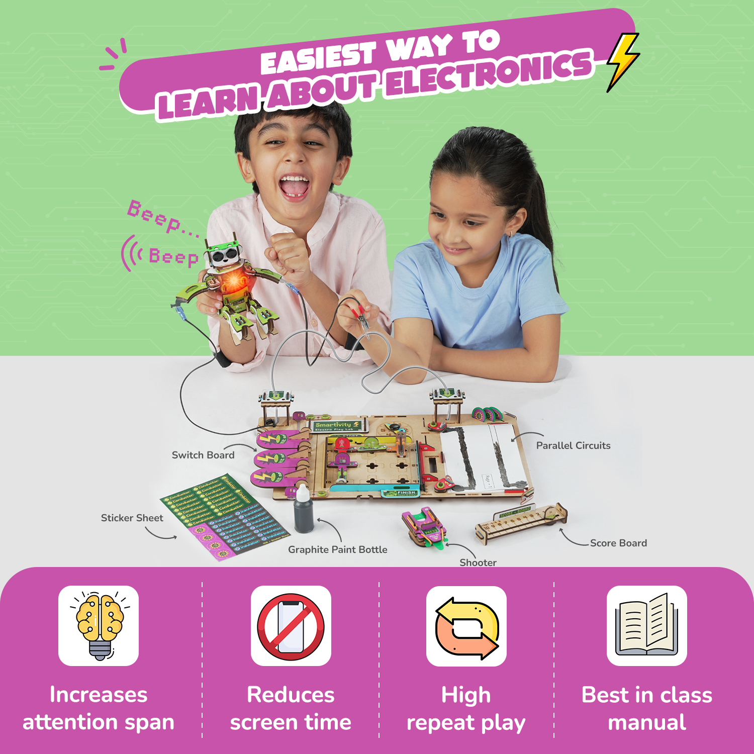 Tag læring til et nyt niveau med Smartivitys Electro Play Lab – et DIY-sæt, der gør videnskab sjovt og interaktivt. Byg spændende elektriske kredsløb, eksperimentér med lys, lyd og bevægelse, og forstå, hvordan elektricitet fungerer i hverdagen. Lavet af sikre og bæredygtige materialer, er dette sæt perfekt til unge opfindere, der elsker at udforske og skabe. Inspirer nysgerrighed og STEM-færdigheder gennem praktisk sjov – det er ren elektrisk energi